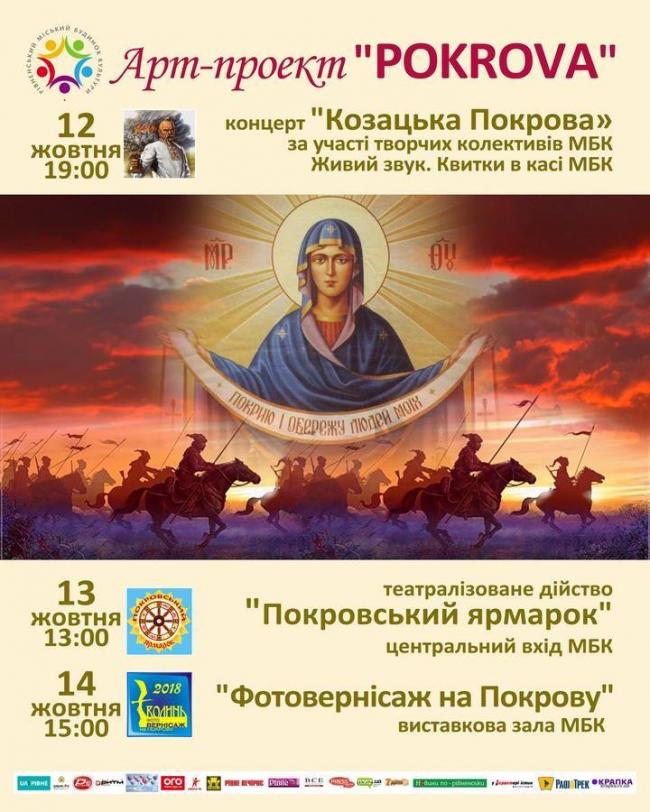 Арт-проект «Покрова» розпочинається сьогодні. О 19-й годині у глядацькій залі відбудеться концерт «Козацька Покрова» за участі творчих колективів МБК. Квитки – у касі МБК.