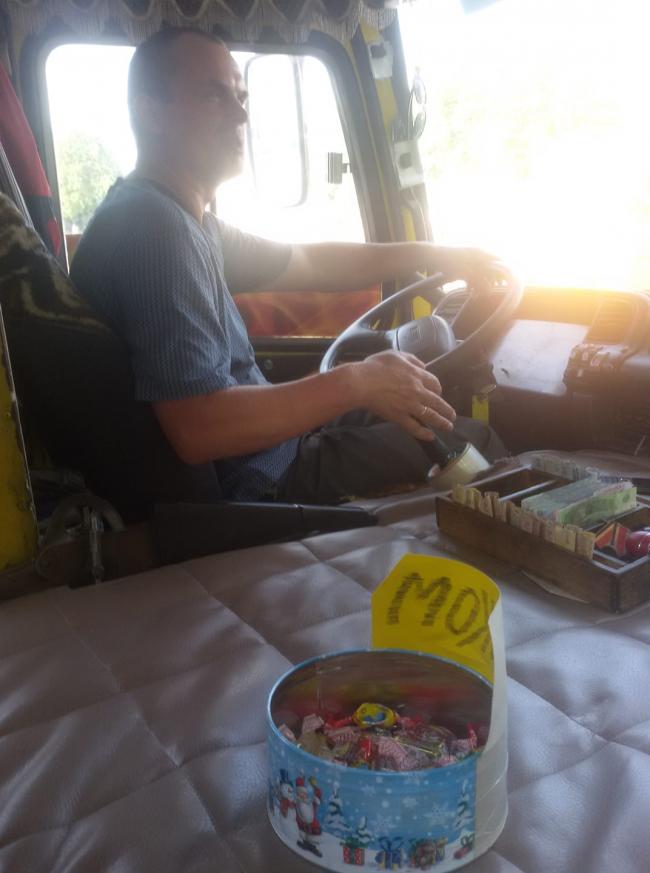 Водій маршрутки №47 поставив баночку з цукерками та пригощав них усіх охочих.