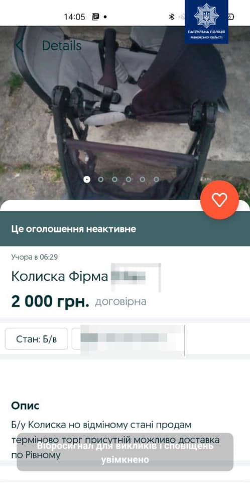 Вчора на лінію 102 патрульним надійшов виклик — чоловік на сайті продажу речей упізнав свій дитячий візок, який напередодні викрали з під’їзду. За фактом викрадення чоловік до поліції не звертався. А коли дружина переглядала оголошення то побачила дитячий візок схожий із викраденим. Рівнянин домовився з покупцями про зустріч, але про неї повідомив патрульним, що у разі ситуації, коли він впізнає свою річ патрульні б втрутились.