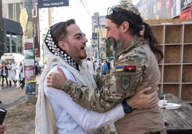 На ньому єврей цілує червоно-чорний шеврон із зіркою Давида бійця полку «Азов».