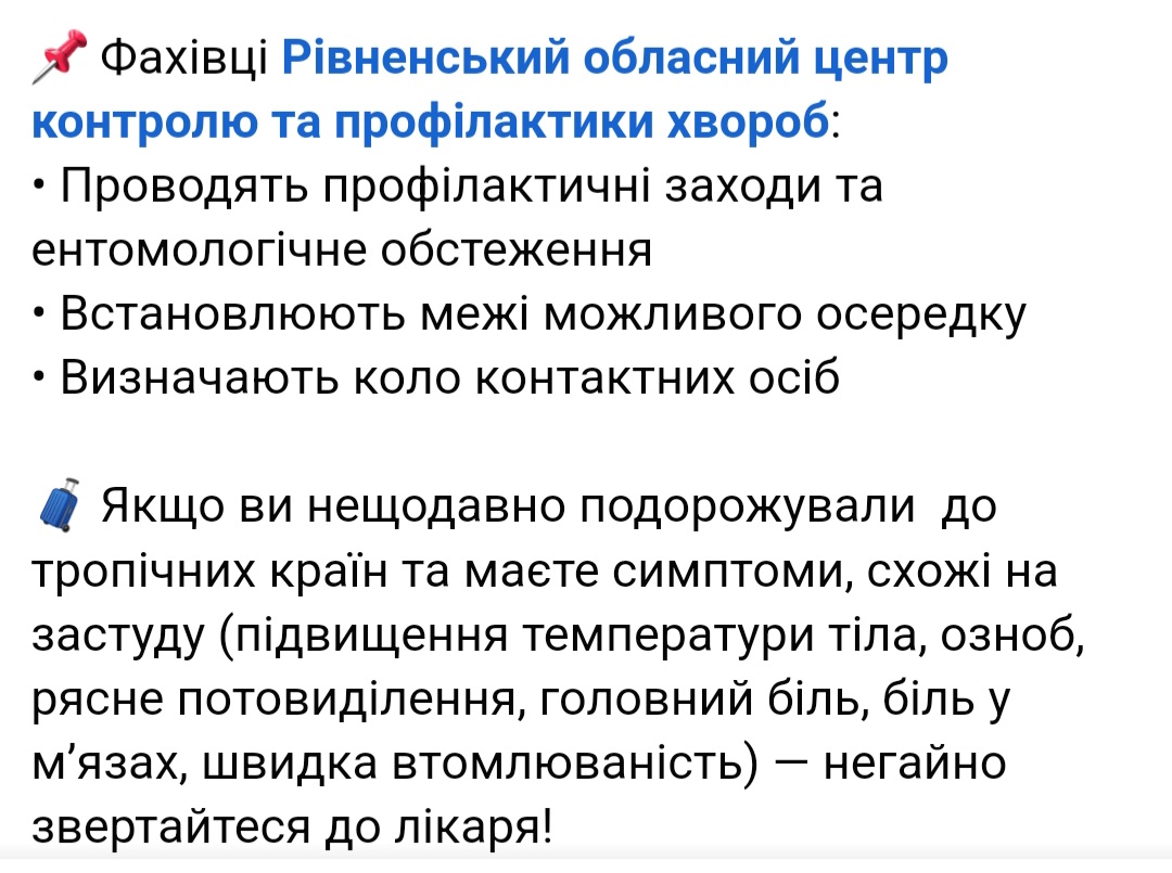 У Рівному виявили перший у 2025 році випадок тропічної малярії, – повідомили в обласному центрі контролю та профілактики хвороб.