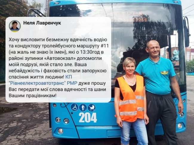 – Той випадок, коли власні коментарі зайві, адже все сказано нашими вдячними пасажирами, – повідомили у прес-службі підприємства. – Герої сьогоднішньої публікації – подружжя Ніна та Василь Чернеги. Вони йдуть разом не тільки по життю, але і на роботі, оскільки працюють у парі: Ніна – кондукторкою, а Василь – водієм. Слово “герої” щодо них вжито зовсім невипадково – вчора під час зміни вони фахово надали першу медичну допомогу пасажирці, яка знепритомніла, та викликали медиків. Пані Неля Лавренчук просить передати їм слова подяки, що ми з радістю і робимо. І нагадуємо, що людяність – понад усе!