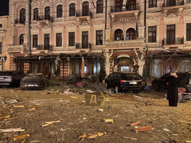 Як повідомляє кореспондент «Думської» з місця подій, унаслідок падіння уламків ракети сильно постраждала будівля готелю «Брістоль», яка була збудована в 1898-1899 роках за проектом архітектора Олександра Бернардацці. Італійська (колишня Пушкінська) і Грецька вулиці усипані уламками.