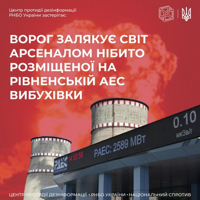 – Застерігаємо! Ця інформація не відповідає дійсності! – повідомляє Центр протидії дезінформації РНБО. – Особливо різко «вкид» розвідки рф контрастує з повідомленням про «початок роботи місії МАГАТЕ на Рівненській АЕС, яка фіксуватиме будь-які загрози, що можуть мати [станції] через військові дії».