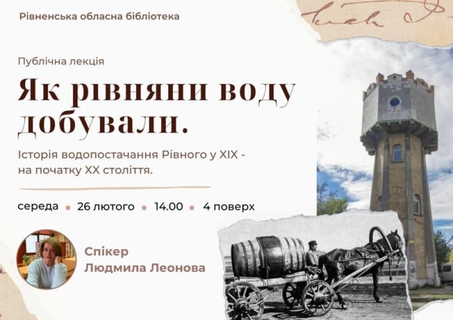 – Запрошуємо вас 26 лютого о 14:00 на публічну лекцію рівненської краєзнавці Людмили Леонової «Як рівняни воду добували. Історія водопостачання Рівного у XIX – на початку XX століття», – повідомляє Рівнеоблводоканал.