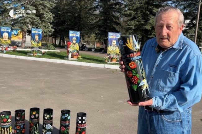 Першу зробив для зятя Павла Гаврилюка, який загинув у 2023 році. На кожній гільзі виведений позивний загиблого, усі малюнки відрізняються. Їх використовуватимуть як вази для квітів, повідомляє Суспільне.