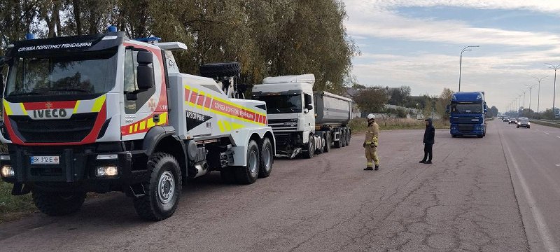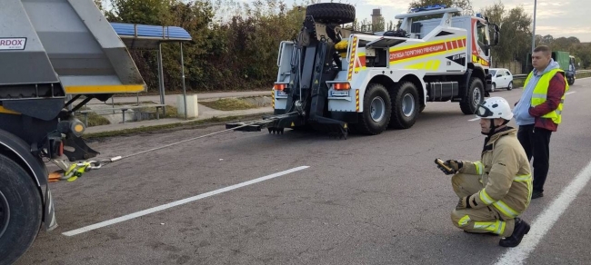 За допомогою лебідки рятувальники відбуксирували вантажний автомобіль до узбіччя дороги. Автомобільну смугу траси Київ-Чоп було розблоковано. .