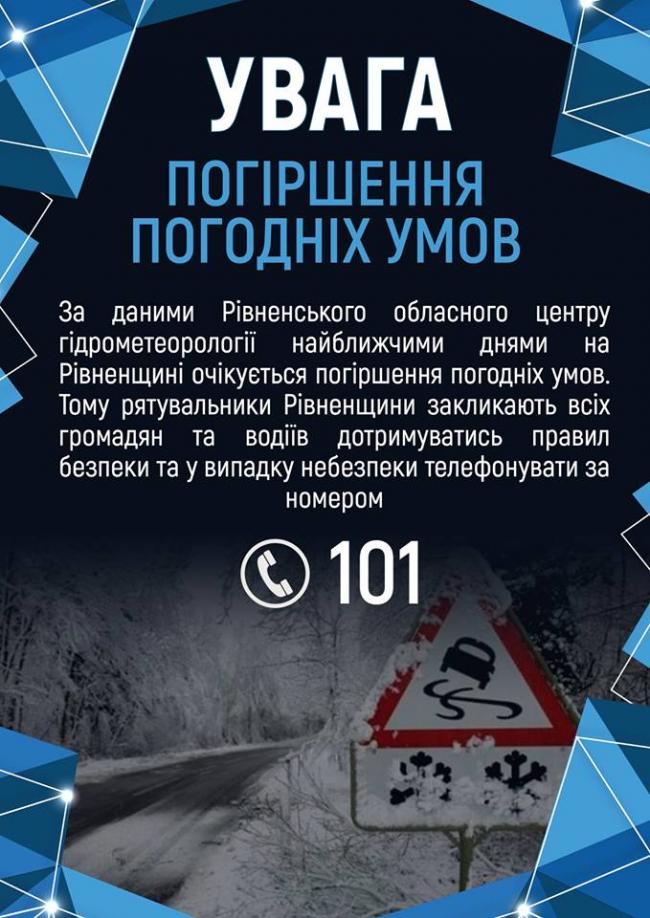 – Такі погодні умови ускладнюють рух та є небезпечними для керування транспортними засобами, тому рятувальники спільно з поліцією звертають особливу увагу водіїв на безпеку дорожнього руху під час зимової негоди та необхідність заміни літніх шин на зимові, – повідомляє у Фейсбуці генерал-майор Сергій Крук, керівник рятувальної служби Рівненщини, та радить, – У випадку позаштатної ситуації телефонуйте за екстреними номерами «101» та «102». Бережіть своє життя та здоров’я!