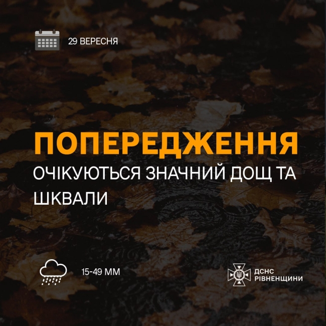 За інформацією Українського гідрометеорологічного центру 29 вересня, в області очікується значний дощ (15-49 мм за 12 год і менше), вдень місцями шквали 15-20 м/с.