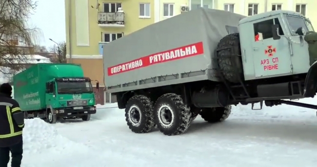 13 лютого о 08.57 до рятувальників надійшло повідомлення про те, що в місті Рівне на вулиці Парковій зі снігового замету не може виїхати вантажний автомобіль з обладнанням рок-гурту «БЕZ ОБМЕЖЕНЬ».