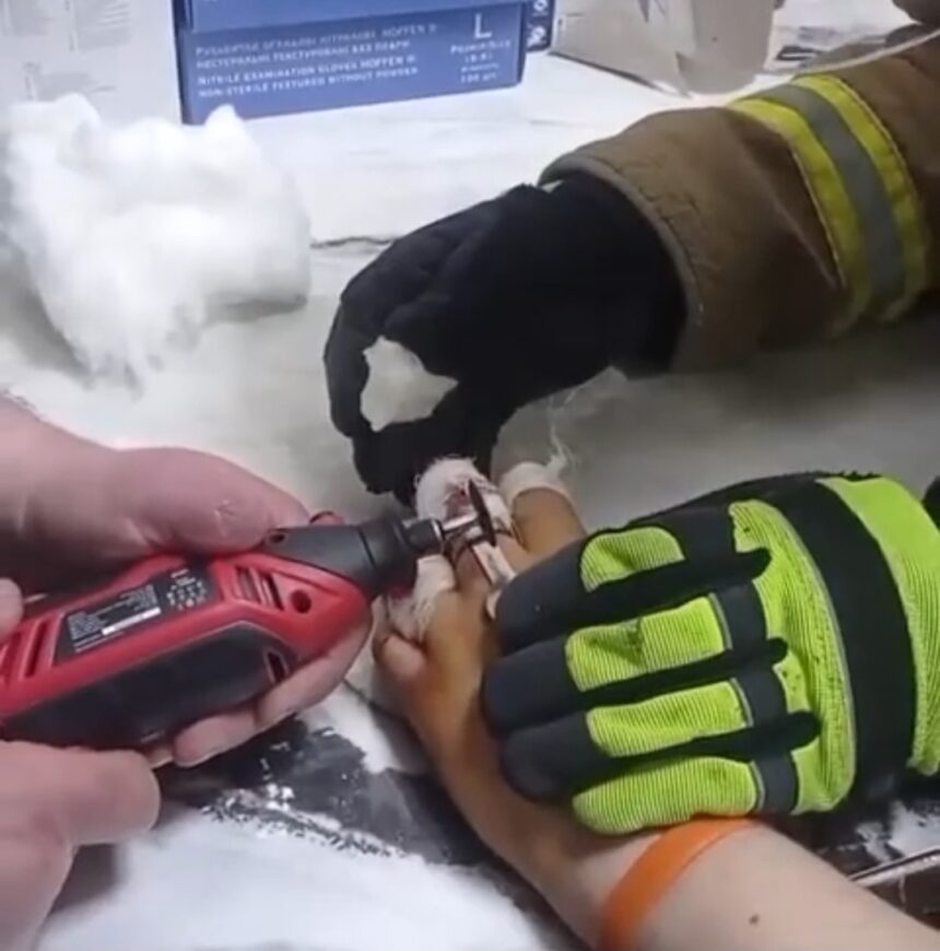 За допомогою спеціального інструменту — гравера — рятувальники обережно розрізали металеве кільце, не завдавши хлопцю додаткового болю чи ушкоджень.
