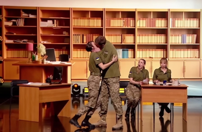 Номер стосувався стосувалися ситуацією з поцілунками. У гумористичному номері говорилося, що росіяни встановили камери та жучки у рівненському ТЦК. Тому Олександр Ярмошевич придумав такий спеціальний шифр, щоб росіяни не знали, які проблеми з мобілізацією у Рівному. Саме тому комісар по-особливому цілує жінок та передає спеціальні сигнали.