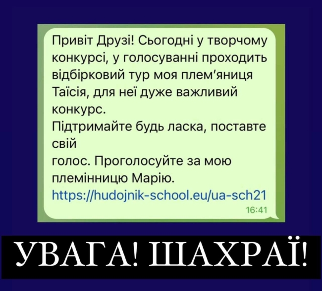 Не переходьте за посиланнями, не вводьте персональні дані для того, щоб проголосувати. Це шахрайська схема, за допомогою якої шахраї вимагають гроші в людей з вашого списку контактів.