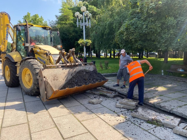 – Працівники Рівненського міського тресту зеленого господарства проводять демонтаж тротуару із бетонних плит. Далі очищують дощопримаймачі. Ті, які вже не придатні, замінюють на нові.