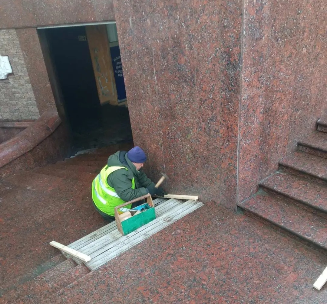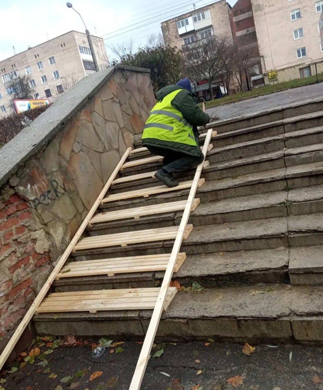 Аби уникнути травмувань під час снігопадів та ожеледиці працівники Тресту зеленого господарства встановили спеціальні дерев’яні трапи на сходинках у місті.
