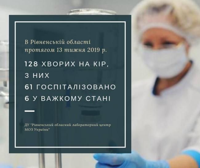 Було госпіталізовано 61 хворий, з них 36 дітей. Упродовж тижня у відділення анестезіології та інтенсивної терапії госпіталізовано 6 хворих (5 дітей та 1 дорослий) з тяжким перебігом кору ускладнений двобічною пневмонією. Найбільше хворих за тиждень зареєстровано у Рівненському (30 хворих) і Березнівському (17) районах та м. Рівне (27).