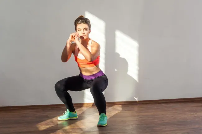 Як це робити: почніть із глибокого присідання, поставивши ноги на ширину плечей. Встаньте, потім підніміться на носочки. Опустіться назад у присед і повторіть рух.