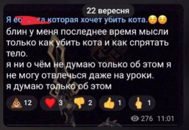 Зоозахисники повідомляють про факт жорстокого поводження з тваринами, про який стало відомо із численних публікацій в соцмережах: 12-річна школярка описує свій намір та бажання вбити кота. Відео знущань вона розповсюджувала у своєму телеграм-каналі, який після розголосу її жорстоких дій в соцмережах видалила.