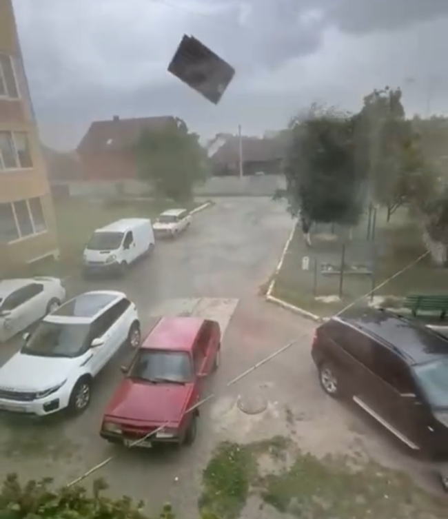 Вчорашня негода не тільки валила дерева у різних районах області, а й робила іншу шкоду. У соцмережах виклали відео, як з даху будинку на припарковане у дворі авто летить щось схоже на частину покрівлі і розбивається вщент.