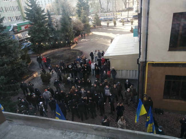 Під стінами сесійної зали на вулиці Поштовій знову зібрався натовп – майорять прапори та лунають вигуки:”ганьба!”. Біля пікетувальників багато правоохоронців, так само, як і в самій будівлі.