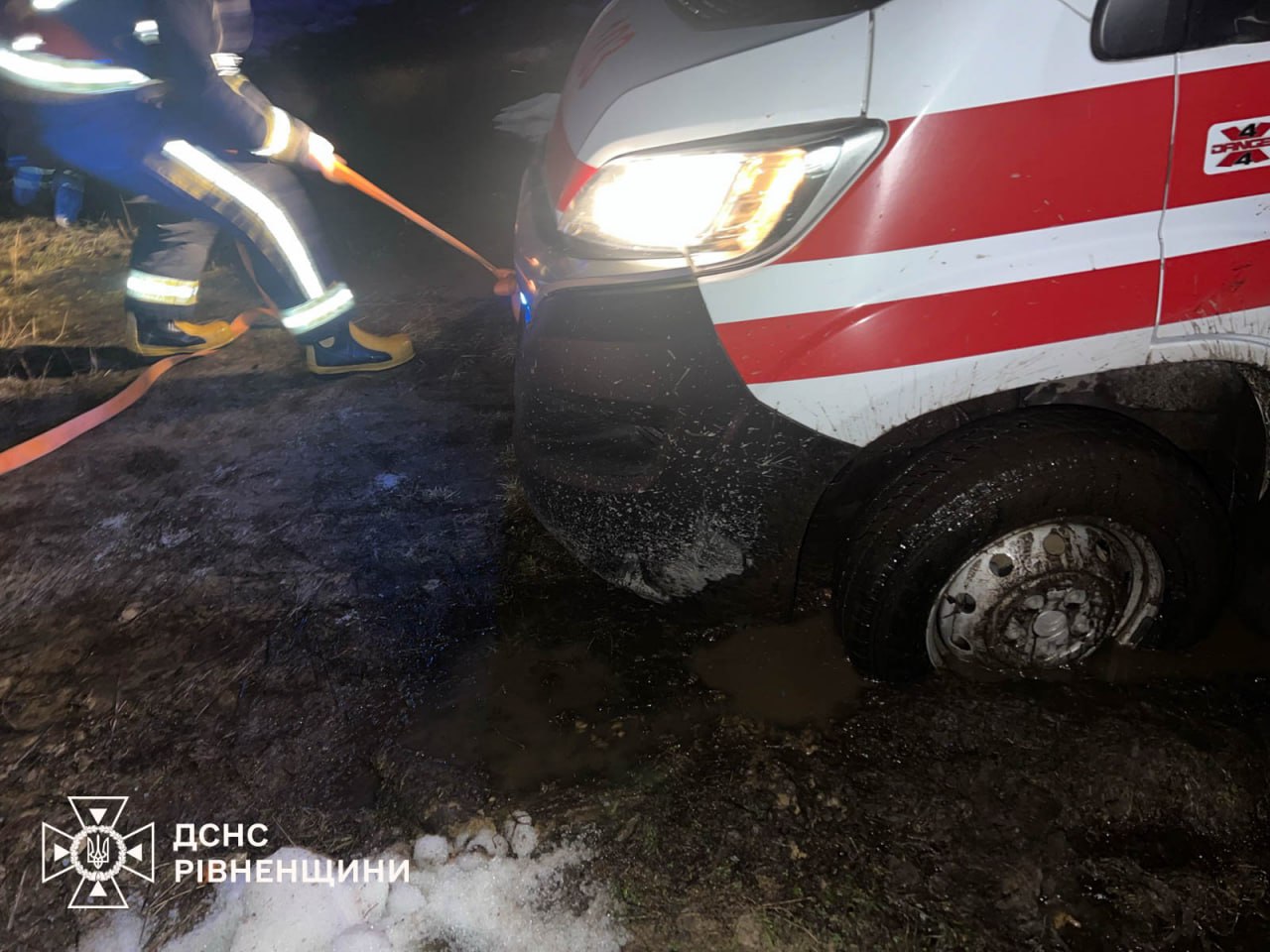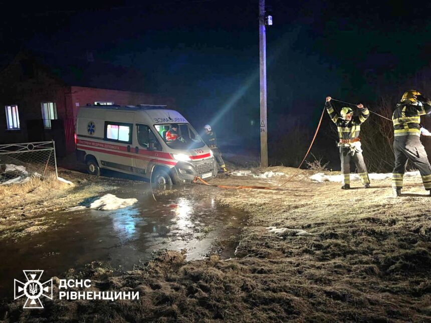 – Сьогодні о 00:03 на спецлінію «101» надійшло повідомлення про те, що поблизу села Орв’яниця Сарненського району застрягла карета швидкої медичної допомоги. Медики здійснювали госпіталізацію важкохворого пацієнта, однак через складні дорожні умови автомобіль загруз у багнюці та не міг самостійно продовжити рух, – пояснюють у Головному управлінні ДСНС Рівненщини.