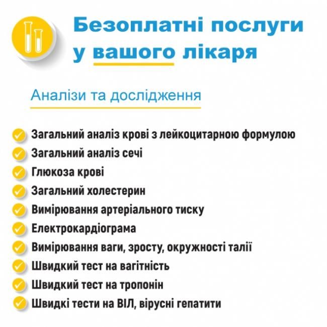 На рівні первинної меддопомоги у пакет безплатних послуг входять такі аналізи і дослідження: загальний аналіз крові з лейкоцитарною формулою, загальний аналіз сечі, глюкоза крові, загальний холестерин, вимірювання артеріального тиску, електрокардіограма, швидкі тести на вагітність, тропонін, ВІЛ та вірусні гепатити. Інші дослідження та аналізи виконуються за направленням вашого лікаря у закладах спеціалізованої допомоги.