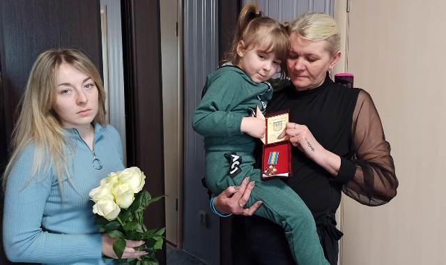 Орден “За мужність” ІІІ ступеня замість татуся державну нагороду отримали донечка Кіра та її мама Вікторія. Це вже друга отримана ними нагорода.