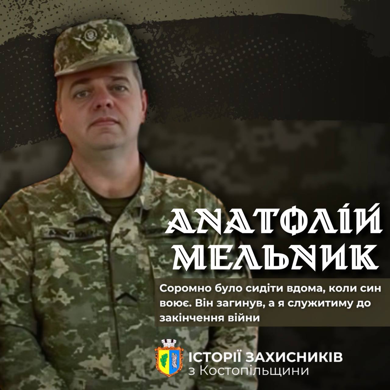 Костопільчанин Анатолій Мельник пішов до війська після того, як його сина Василя Мельника у 2015 році мобілізували. На превеликий подив батька, Василь сам цього хотів. Невдовзі він підписав свій перший контракт із ЗСУ, служив в артилерії. Відтоді батько і син Мельники були на військовій службі. У листопаді 2024-го 30-річний Василь загинув. Батько, Анатолій Мельник, служить і служитиме до закінчення війни, - таку історію про хоробрих земляків розповіли у Костопільській міській раді.