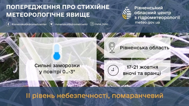 по м.Рівне: вночі заморозки 0..-2°, вдень +9..+11º.