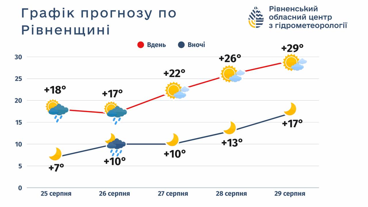 – Початок тижня зустріне осінньою прохолодою, але з середи почне надходити повітряна маса тропічного походження, яка поверне на Рівненщину теплу та літню погоду, – кажуть в обласному центрі з гідрометеорології.