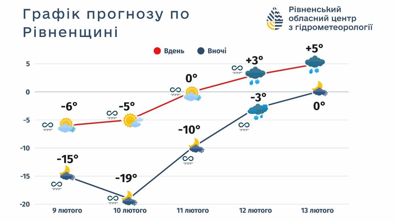 – Після морозної ночі 10 лютого на Рівненщину почне поширюватись тепле атлантичне повітря. Температура поступово підвищиться і вже 13 лютого становитиме вночі -3,+2, вдень 0-5° тепла, – потішили прогнозом в обласному центрі з гідрометеорології.