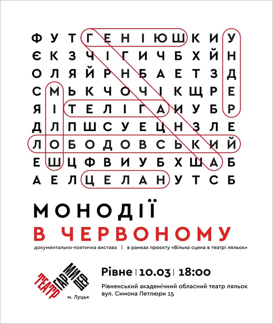 Ця вистава була створена театром «Гармидер» у 2017 році лабораторно під час усамітнення творчого колективу в селищі Ворохта. «Монодії в червоному» побували на фестивалях у Харкові, Києві, Чернівцях, Коломиї, Володимирі-Волинському, Солігорську і Батумі.