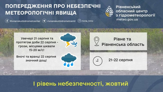 Увечері 21 серпня та протягом доби 22 серпня очікуються грози, місцями шквалисте посилення вітру 15-20м/с! Вночі та вранці 22 серпня значний дощ! 1-й рівень небезпечності -  жовтий. Погодні умови можуть призвести до ускладнення роботи енергетичних, будівельних, комунальних підприємств та руху транспорту! - повідомляють в обласному центрі з гідрометеорології.