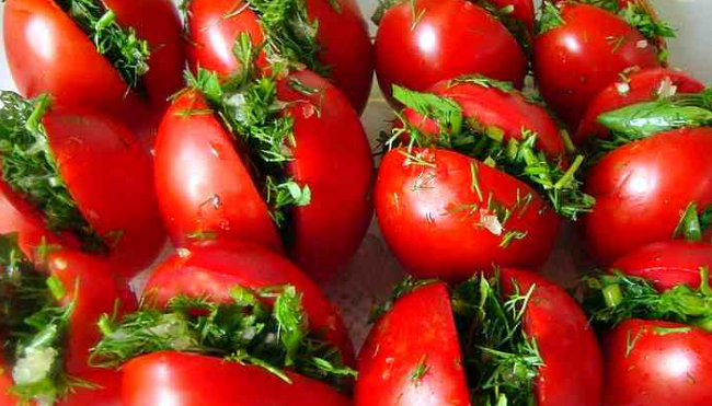 3 кг середніх помідорів, кілька зубчиків часнику, зелень кропу і петрушки
