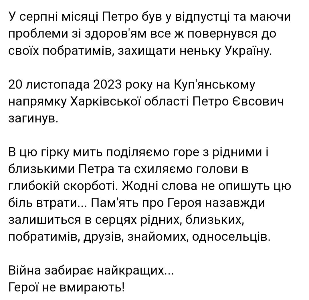Звістка про його загибель надійшла до Миляцької громади. Сьогодні по обіді молодий захисник назавжди повернеться додому, тож мешканців просять гідно його зустріти. Поховають Петра Євсовича завтра у селі Смородськ..