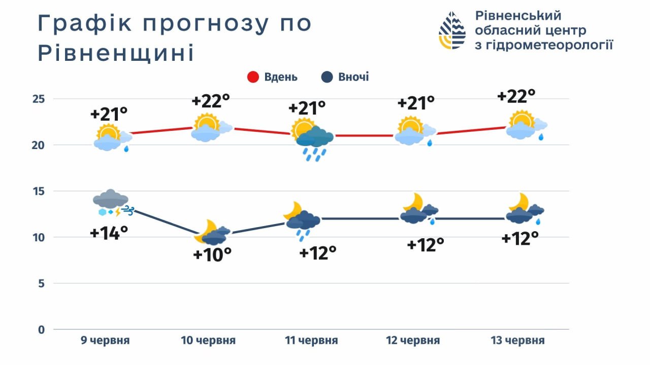– Мінлива хмарність. Вночі невеликий, вдень помірний короткочасний дощ, місцями гроза, слабкий град. Вітер південно-західний, 7-12 м/с. Температура вночі 9-14º, вдень 16-21º. Атмосферний тиск буде падати.