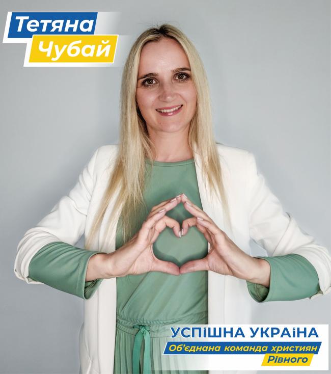 «Об’єднана команда християн Рівного надала мені 100% кредит довіри. Саме тому прийняла ствердне рішення балотуватися на посаду міського голови Рівного. Усе роблю у своєму житті щиро, якісно і з любов’ю до людей. Вірю, що з Божою допомогою ми зможемо досягнути поставлених цілей. Адже світло завжди перемагає!», – зазначила Тетяна Чубай.
