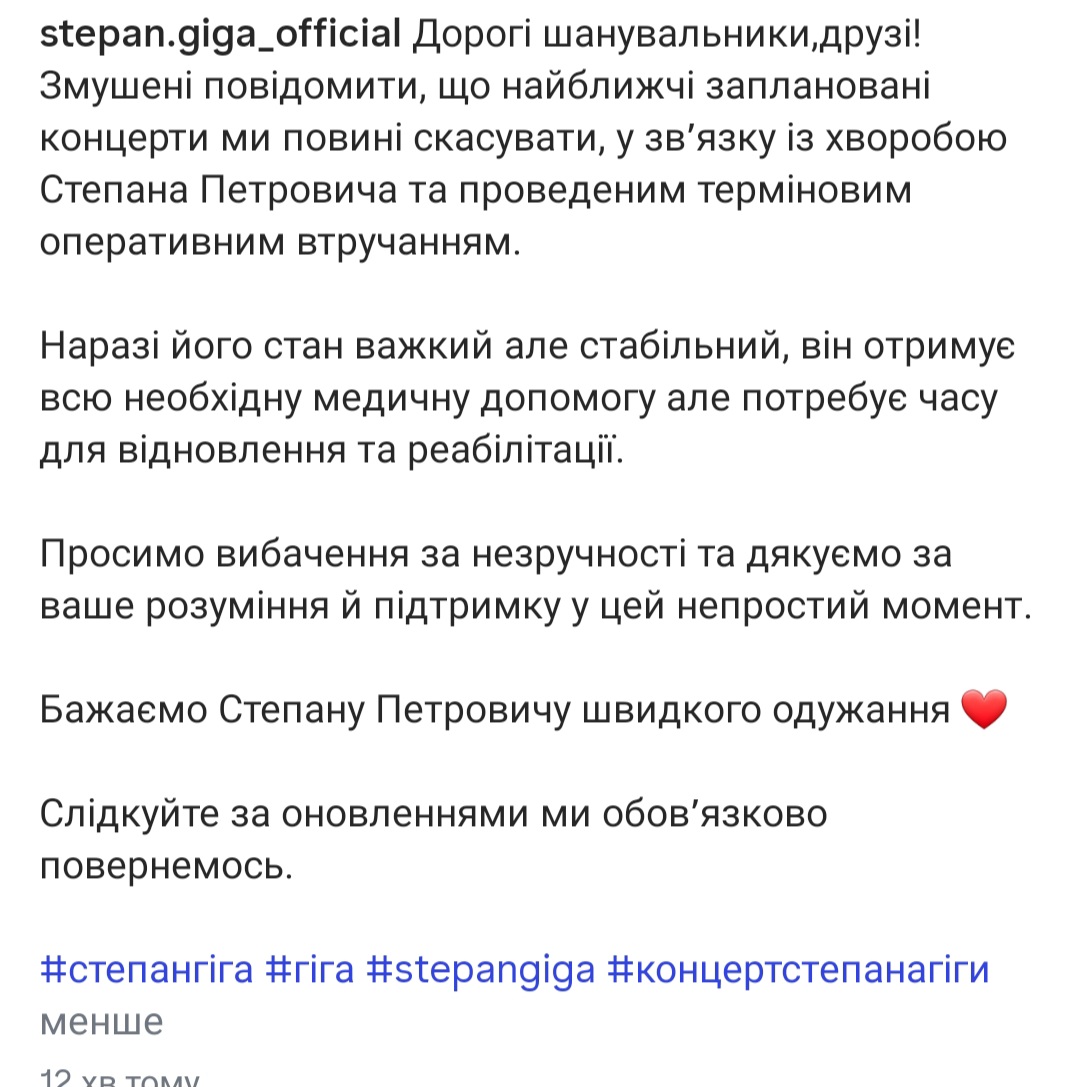 Про це сьогодні повідомили на офіційній інстаграм-сторінці Степана Гіги. До слова, у Рівному його концерт спільно з гуртом “Друзі мої” запланований увечері 2 грудня в міському будинку культури.