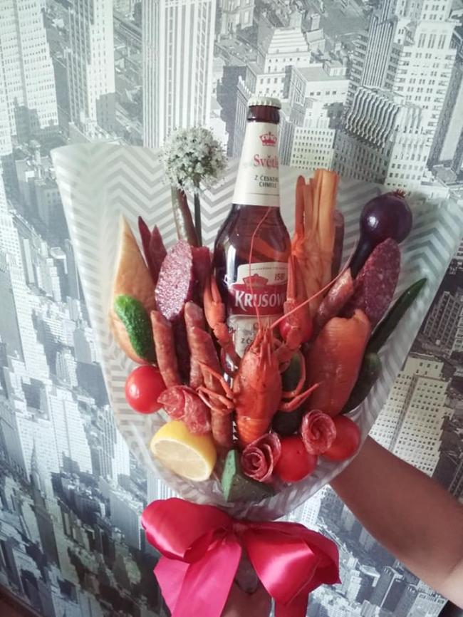Вродлива дівчина з Варашу робить неймовірної краси букети. Унікальність їх полягає в тому, що як матеріал для своїх творінь вона використовує не квіти, а цукерки, яблука, ковбаси і навіть пиво з раками.