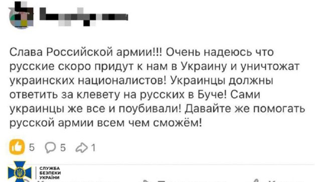 Прес-служба СБУ області публікувала скріншот одного з дописів чоловіка, у якому той заявляв, що українці «повинні відповісти за наклепи щодо росіян у Бучі, бо вони самі там себе повбивали». Також він закликав підтримувати російську армію.
