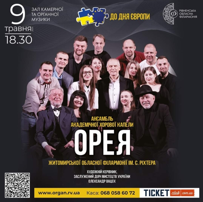 9 травня у Рівному до Дня Європи виступить ансамбль академічної хорової капели «Орея» Житомирської обласної філармонії імені С. Ріхтера.