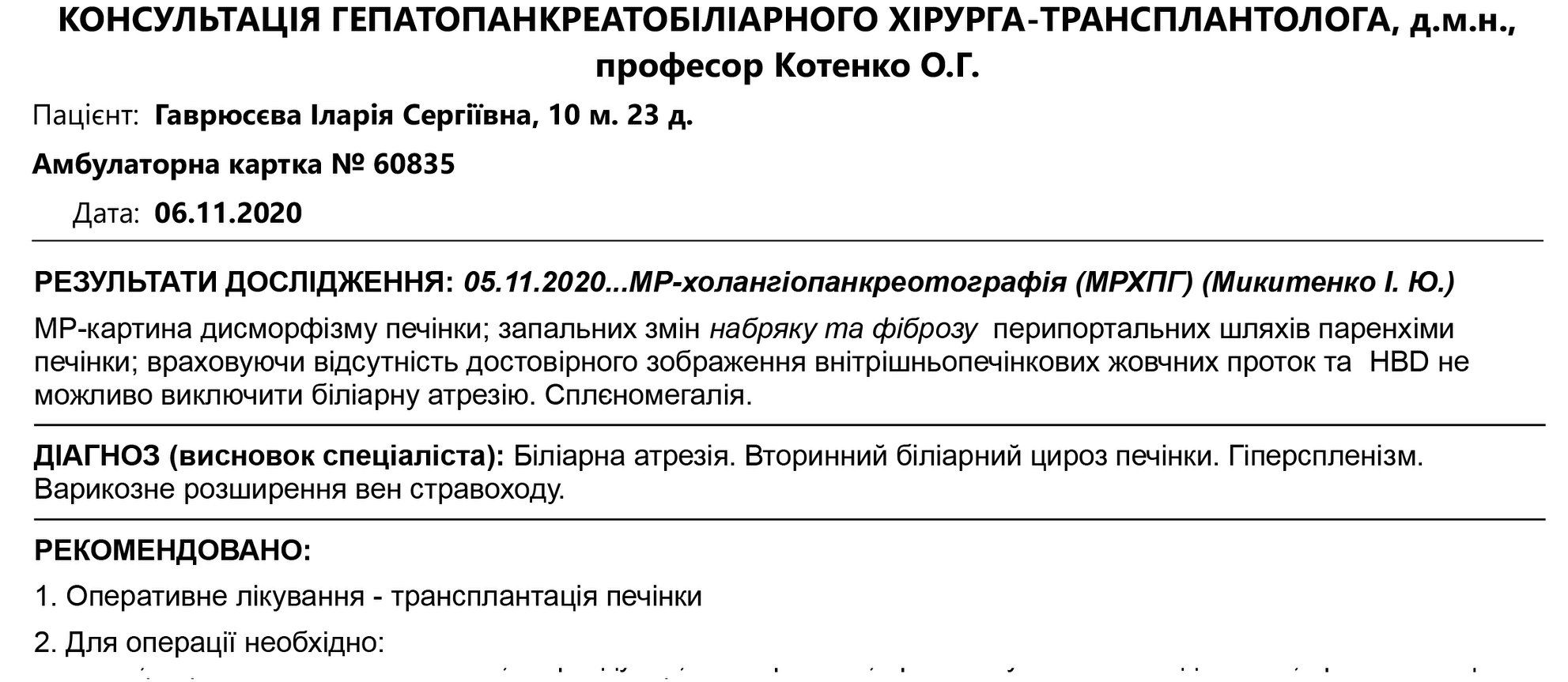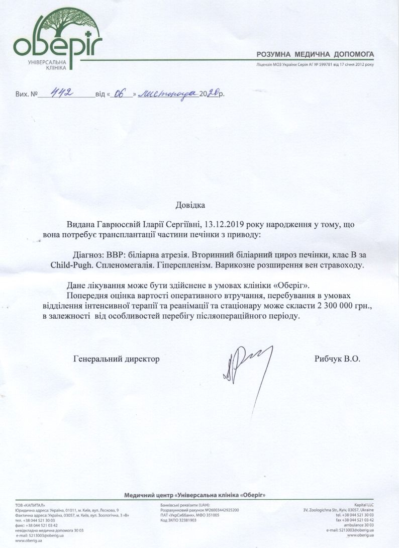 Тиждень тому нам встановили діагноз біліарна атрезія. Для врятування життя дитини потрібна якомога швидше пересадка печінки від родича донора. Таку операцію беруться зробити в Україні лікарі в клініці «Оберіг», але наразі вартість даної операції більше 2 млн. гривень, і наша родина немає таких коштів. Прошу Вас допомогти зібрати кошти на операцію