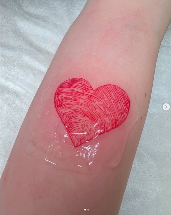 Відбиток пальців мами і тата замовниці у формі сердечка у червоному кольорі. Фото: instagram.com/karrina.tattoo/