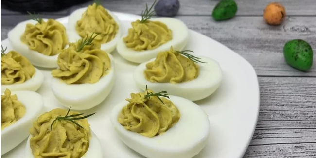Приготування. Обережно почистіть зварені на круто яйця, розділіть кожне на дві половини, вийміть жовтки. Візьміть м’який авокадо, почистіть та розімніть виделкою у тарілці. Наріжте цибулю та рибу дрібними шматочками, розімніть жовтки — додайте в тарілку до авокадо. Ретельно перемішайте всі продукти до однорідної маси з додаванням соусу та гірчиці. Наповніть кожну половинку яйця готовою начинкою, а зверху прикрасьте зеленню.