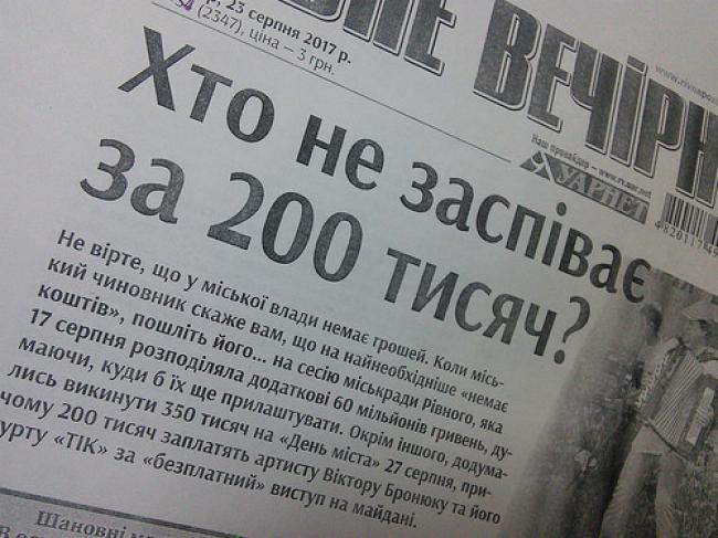 На першій сторінці завтрашнього номера «Рівне вечірнє» читайте про виділення 200 тис. з міського бюджету на концерт гурту «ТІК» у Рівному та про те, чому в інших обласних центрах «хедлайнери» не співають за бюджетні гроші.