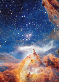 3) Космічний телескоп «Джеймс Вебб» зобразив цю сяючу картину народження зірок, у центрі якої — Пісміс 24, молоде зоряне скупчення в ядрі прилеглої туманності Лобстер, розташованої приблизно в 5500 світлових років від Землі в сузір’ї Скорпіона. Будучи одним із найближчих регіонів активного та масивного зіркоутворення, Пісміс 24 дає рідкісну можливість зазирнути в природу великих та масивних зірок. Завдяки своїй відносній близькості цей регіон є одним із найкращих об’єктів для вивчення властивостей гарячих молодих зірок та того, як вони еволюціонують.