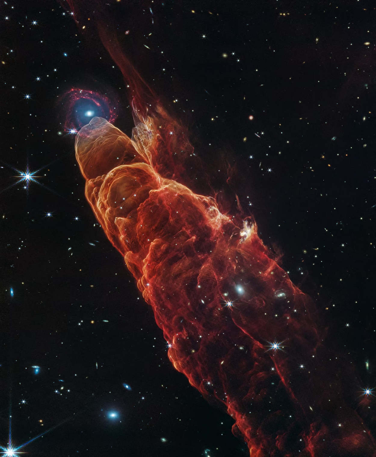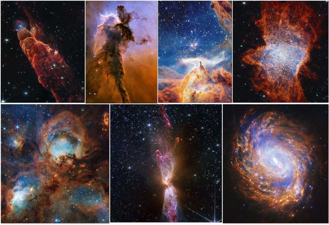 1) Знімок з телескопа «Джеймс Вебб» демонструє викид речовини із зірки, яка лише формується; саме через це об’єкт Хербіга-Аро (HH 49/50) отримав назву «космічний торнадо». Цей стовп газу та пилу виглядає так, ніби увінчаний галактикою, але насправді галактика знаходиться далеко на задньому плані — на відстані багатьох світлових років. Об’єкти Хербіга-Аро являють собою потоки речовини, що створюються струменями, які викидаються найближчою зіркою, що формується (в даному випадку вона знаходиться за межами кадру, внизу справа). Ці потоки врізаються у щільніші області речовини, створюючи ударні хвилі. Помаранчеві і червоні структури, що клубляться на зображенні стають видимими для «Вебба» в міру того, як речовина в ударних хвилях остигає і починає випромінювати світло у видимому та інфрачервоному діапазонах.