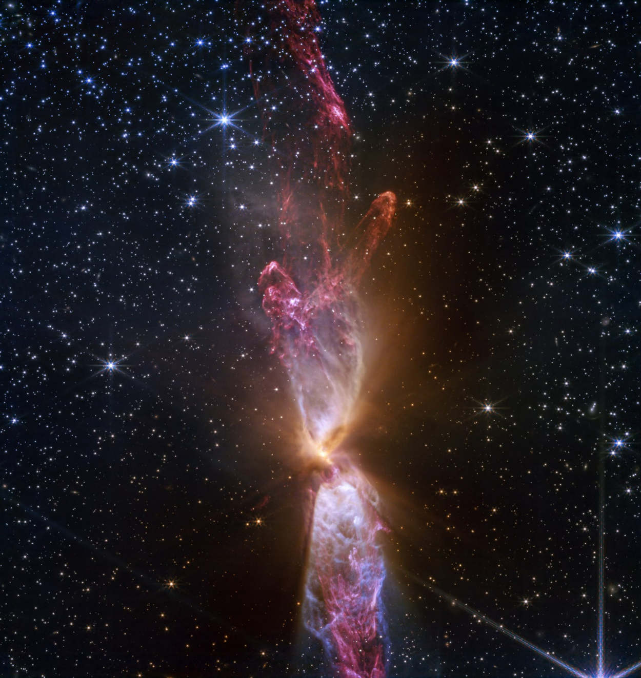 6) Нова фотографія, отримана космічним телескопом «Джеймс Вебб», показує зоряну систему Lynds 483, в якій два активних світила, що формуються, створюють мерехтливі викиди газу і пилу у формі пісочного годинника. Дві протозірки розташовані в центрі цієї структури — усередині непрозорого горизонтального диска холодного газу та пилу.