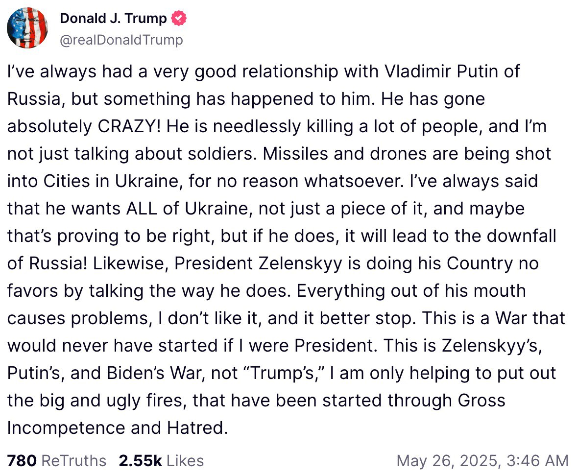 – У мене завжди були дуже хороші стосунки з Володимиром Путіним із Росії, але з ним щось сталося. Він став абсолютно божевільним! Він без потреби вбиває безліч людей, і я говорю не тільки про солдатів. Ракети і безпілотники запускають по містах в Україні без жодної причини. Я завжди говорив, що він хоче отримати ВСЮ Україну, а не тільки її частину, і, можливо, це виявиться правдою, але якщо він це зробить, це призведе до краху Росії, – написав Трамп.