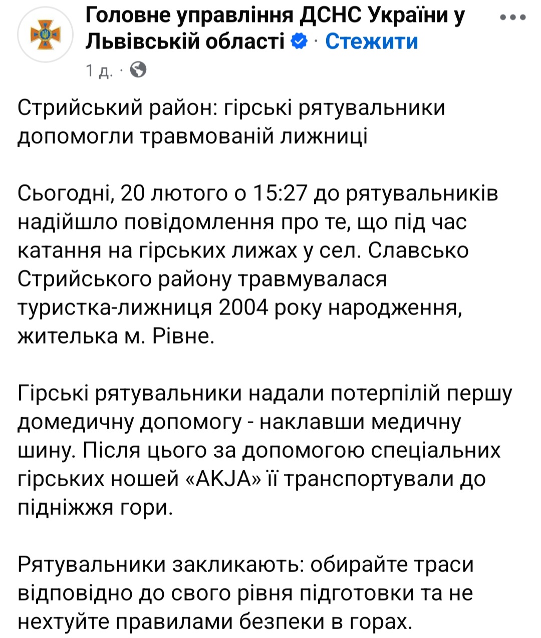 Трапився інцидент у п’ятницю, 20 лютого. Молода рівнянка каталася на лижах на Львівщині, але отримала травму. На допомогу дівчині прийшли гірські рятувальники.
